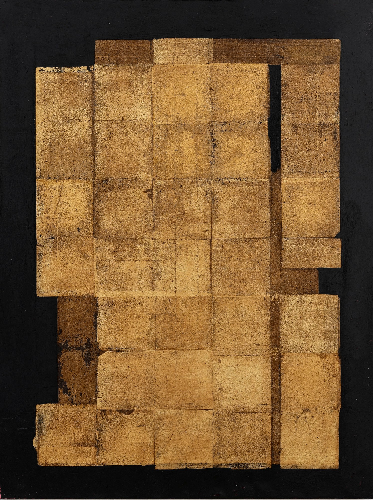 By irradiating light and blurring contours, gold leaf adds a mystical element to the shapes. Its radiance is prolonged into the dark matter by the varnish applied onto the work, giving a totemic and mysterious aspect to it. The weathering of gold leaf also adds an element of venerability, reminiscent of old temples built by ancient and forgotten civilizations.